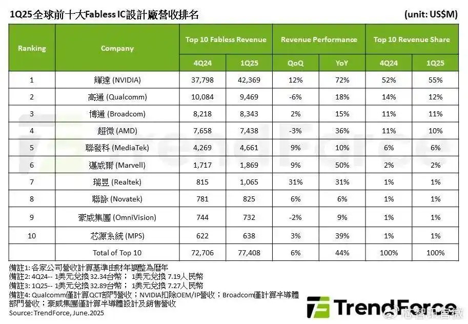 2025Q1全球十大IC设计厂商:英伟达稳居第一,豪威第九!